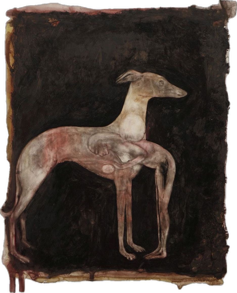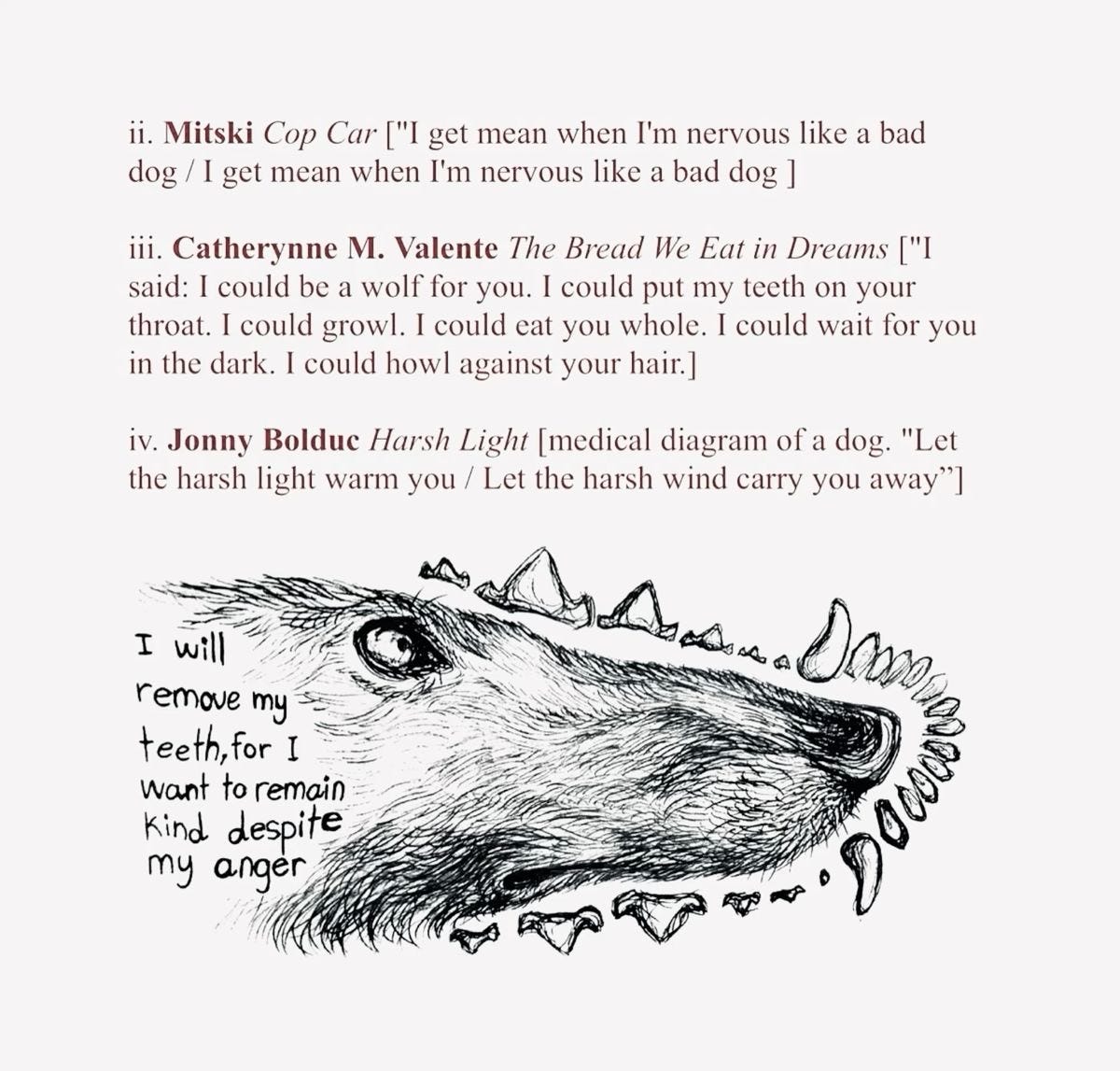 lovesick. wait by the door long after they’re gone. grind your teeth down to stubs. foaming. choke on your own spit throughout the day. call it devotion. frothing. wake to your pillow soaked. body drenched like baptism gone wrong. starved. ribs rattling like a cage with no animal left inside. snapping. lunge at the leash even when it’s gone. filthy. drag your body across the titles just to feel cold. obedient. kneel on bone. stay. stay kneeling. stay. torn. ear shredded from your own claws. ulcered. love turning your stomach into opened wounds. for what? bleeding. stain the floorboards with your own hunger. muzzled. salivating! drown in your own mouth. devotion foams white as milk. gorged. split your belly open searching for warmth. fevered. boil your blood until it hisses // until steam climbs your throat like incense. rabid. convulse! froth crusting your chin like pearls. split-jawed. unhinge your mouth in endless calling. broken. tailbone cracked from kneeling too long. bitten. your own tongue half gone. teeth marks crescent moons. rotting. breath sour as communion left out in the sun. skin peeling back to reveal marrow’s shrine. decomposing. flesh sluicing open. prayer pooling sugar. septic. flies gather at the alter // swarming the gut. Eucharist turned to maggot. slipping. collapse into your own fluids. tail still wagging. apostate. abandon every god but the one who will not claim you.